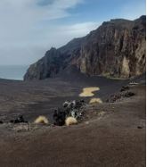 Farol dos Capelinhos, Ilha do Faial. Laavatuhkassa ei vieläkään ole kasvillisuutta, vaikka tulivuorenpurkauksesta on kulunut 66 vuotta.