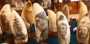 Scrimshaw-museo, Ilha do Faial. Kalastajien taideteoksia valaan hampaisiin kaiverrettuna.