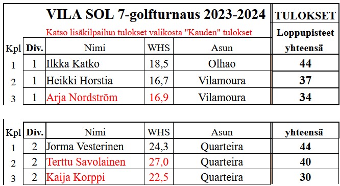 Katso kaikkien osakilpailujen tulokset ja lähtöryhmien valokuvat sekä koko turnaustaulukko turnauksen kotisivuilta www.vilasol.algarvensuomiseura.fi